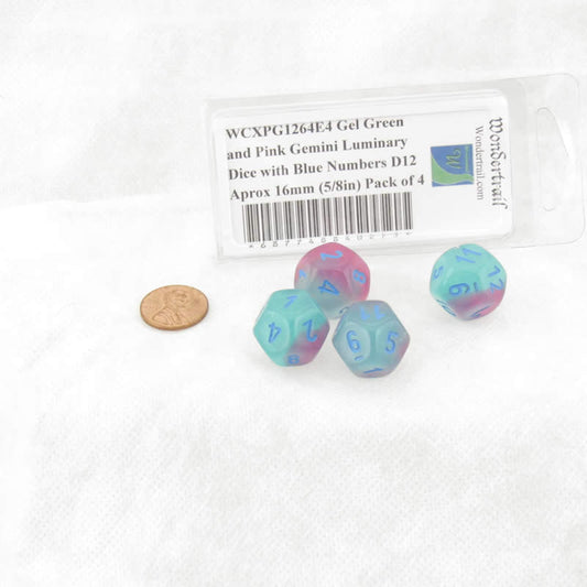 WCXPG1264E4 Gel Green and Pink Gemini Luminary Dice with Blue Numbers D12 Aprox 16mm (5/8in) Pack of 4