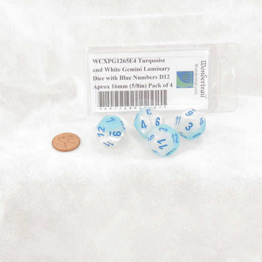 WCXPG1265E4 Turquoise and White Gemini Luminary Dice with Blue Numbers D12 Aprox 16mm (5/8in) Pack of 4