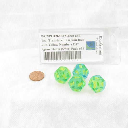 WCXPG1266E4 Green and Teal Translucent Gemini Dice with Yellow Numbers D12 Aprox 16mm (5/8in) Pack of 4