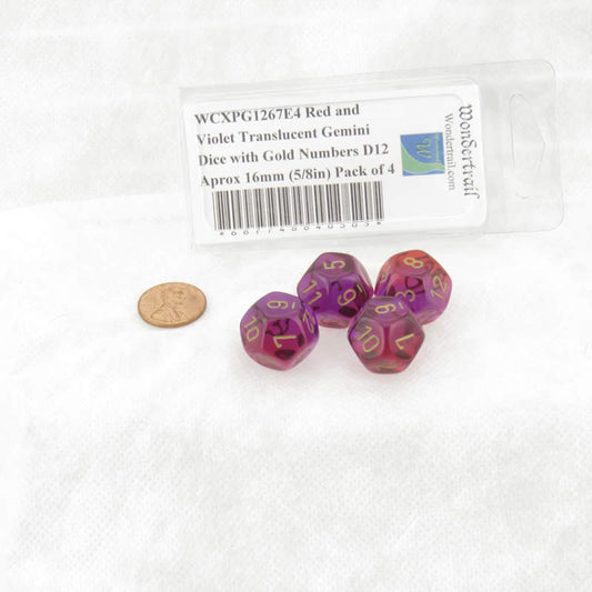 WCXPG1267E4 Red and Violet Translucent Gemini Dice with Gold Numbers D12 Aprox 16mm (5/8in) Pack of 4