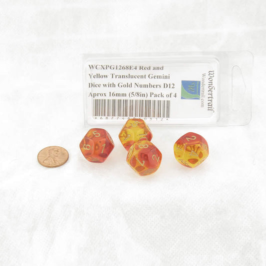 WCXPG1268E4 Red and Yellow Translucent Gemini Dice with Gold Numbers D12 Aprox 16mm (5/8in) Pack of 4