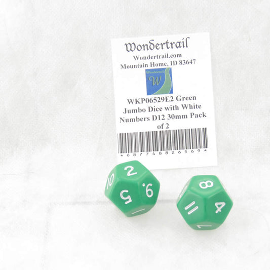 WKP06529E2 Green Jumbo Dice with White Numbers D12 30mm Pack of 2