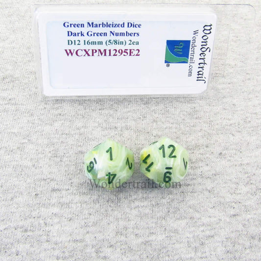 WCXPM1295E2 Green Marble Dice Dark Green Numbers D12 16mm Pack of 2