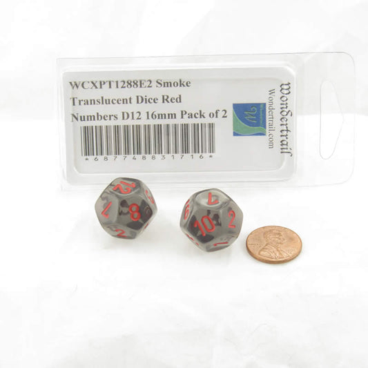 WCXPT1288E2 Smoke Translucent Dice Red Numbers D12 16mm Pack of 2