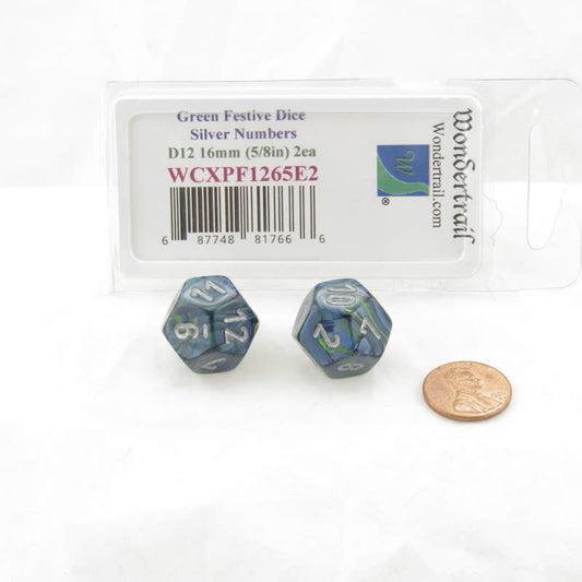 WCXPF1265E2 Green Festive Dice Silver Numbers D12 16mm Pack of 2