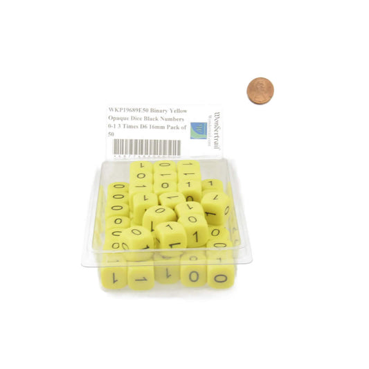 WKP19689E50 Binary Yellow Opaque Dice Black Numbers 0-1 3 Times D6 16mm Pack of 50