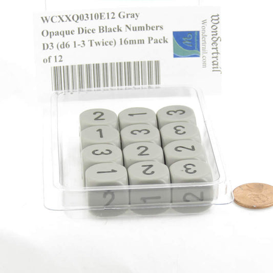 WCXXQ0310E12 Gray Opaque Dice Black Numbers D3 (d6 1-3 Twice) 16mm Pack of 12