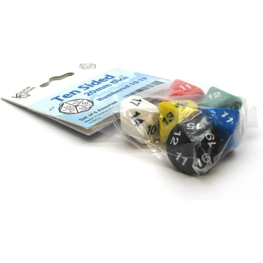 KOP18081 Assorted Color Dice D10 with Colored Numbers 10-19 20mm Pack of 6