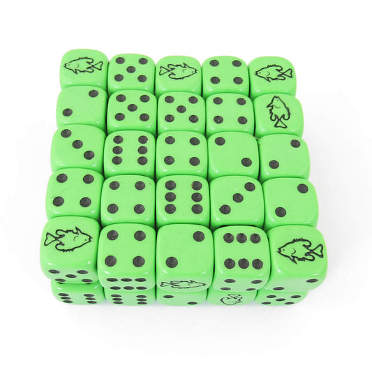 KOP12861 Green Fish Dice with Black Pips D6 16mm (5/8in) Bulk Pack of 50