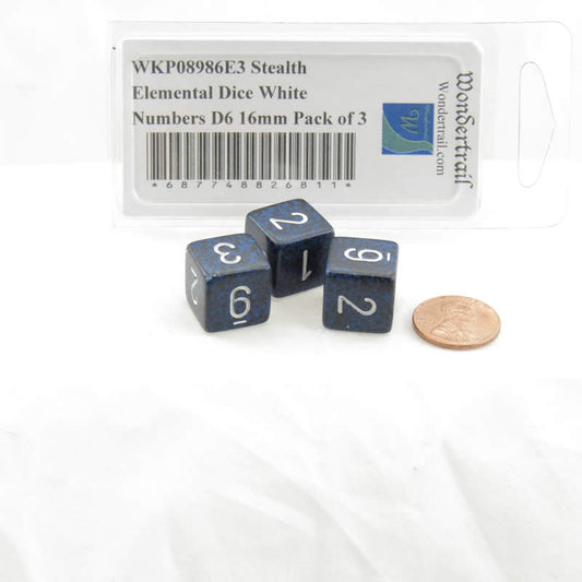 WKP08986E3 Stealth Elemental Dice White Numbers D6 16mm Pack of 3
