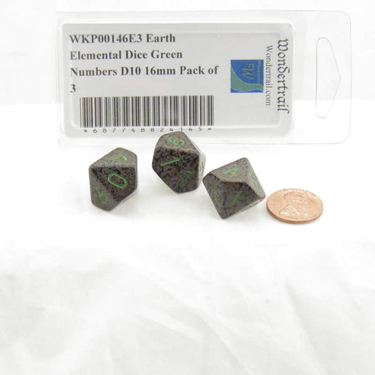 WKP00350E3 Earth Elemental Dice Green Numbers DT10 16mm Pack of 3