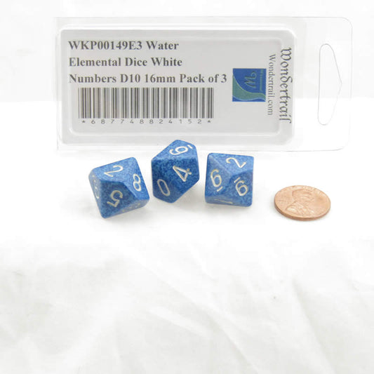 WKP00149E3 Water Elemental Dice White Numbers D10 16mm Pack of 3