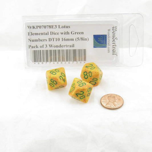 WKP07078E3 Lotus Elemental Dice with Green Numbers DT10 16mm (5/8in) Pack of 3 Wondertrail