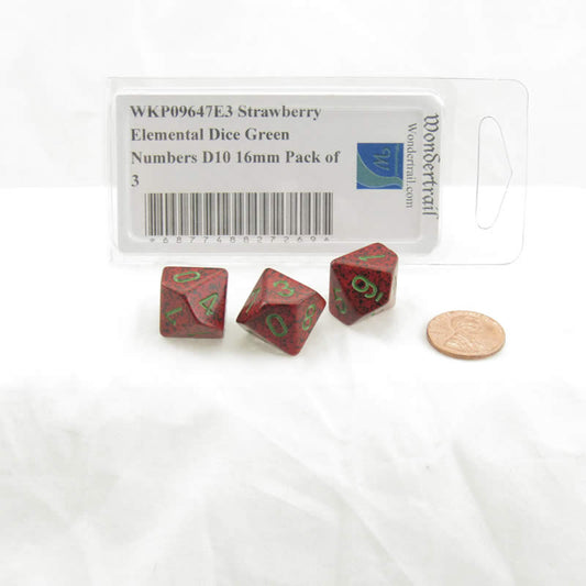 WKP09647E3 Strawberry Elemental Dice Green Numbers D10 16mm Pack of 3