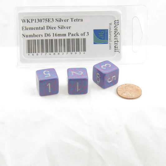 WKP13075E3 Silver Tetra Elemental Dice Silver Numbers D6 16mm Pack of 3