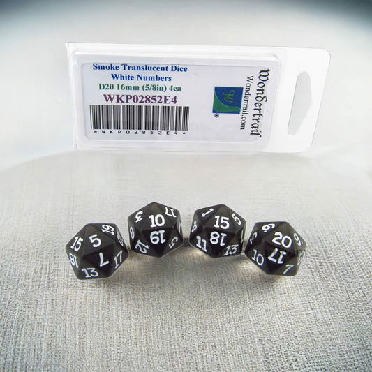 WKP02852E4 Smoke Transparent Dice White Numbers D20 16mm Pack of 4