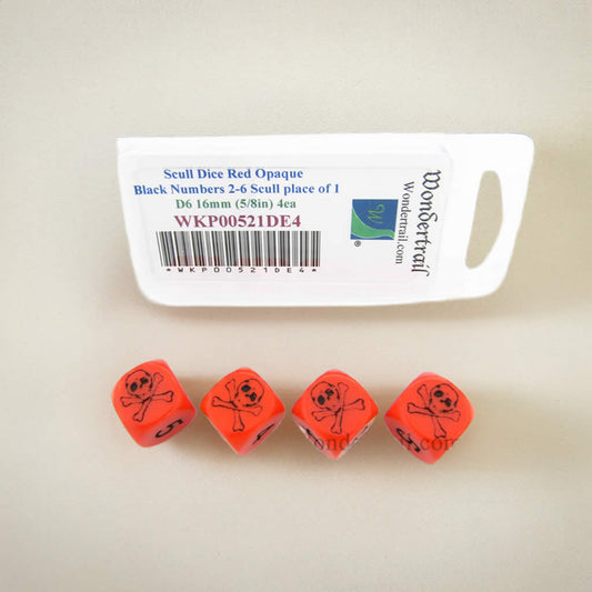 WKP00521DE4 Skull Dice Red Opaque with Black Numbers D6 16mm (5/8in) Set of 4 Dice