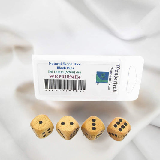 WKP01894E4 Natural Wood Dice with Black Pips D6 16mm (5/8in) Pack of 4