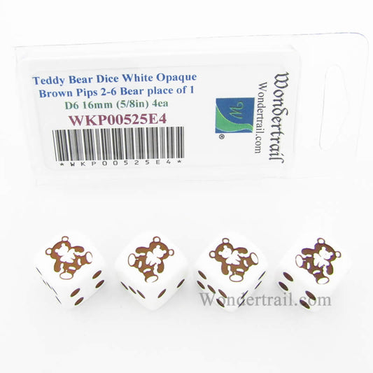 WKP00525E4 Teddy Bear Dice White Opaque Brown Pips D6 16mm Set of 4