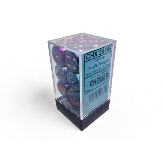 CHX26649 Purple and Teal Gemini Dice with Gold Pips D6 16mm (5/8in) Pack of 12 Dice