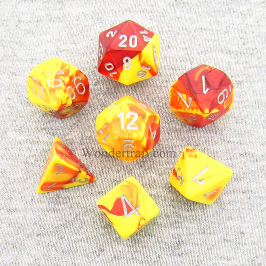 CHX26450 Red and Yellow Gemini Dice Silver Numbers 7 Dice Set 16mm