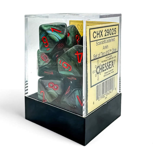 CHX29025 Jade Scarab Dice with Red Numbers and Ankh D10 16mm (5/8in) Pack of 10