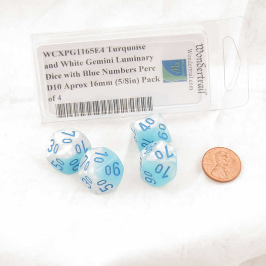 WCXPG1165E4 Turquoise and White Gemini Luminary Dice with Blue Numbers Perc D10 Aprox 16mm (5/8in) Pack of 4