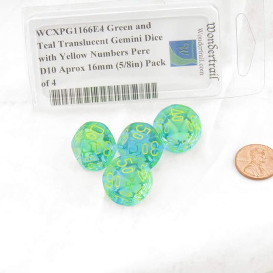 WCXPG1166E4 Green and Teal Translucent Gemini Dice with Yellow Numbers Perc D10 Aprox 16mm (5/8in) Pack of 4