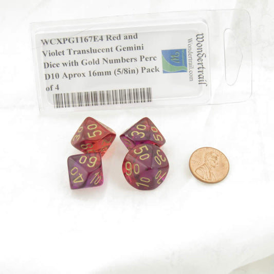WCXPG1167E4 Red and Violet Translucent Gemini Dice with Gold Numbers Perc D10 Aprox 16mm (5/8in) Pack of 4