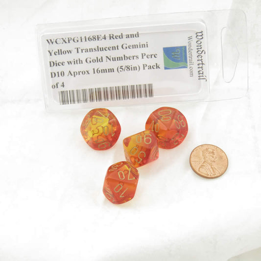 WCXPG1168E4 Red and Yellow Translucent Gemini Dice with Gold Numbers Perc D10 Aprox 16mm (5/8in) Pack of 4