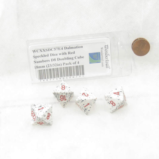 WCXXSDC57E4 Dalmation Speckled Dice with Red Numbers D8 Doubling Cube 18mm (23/32in) Pack of 4