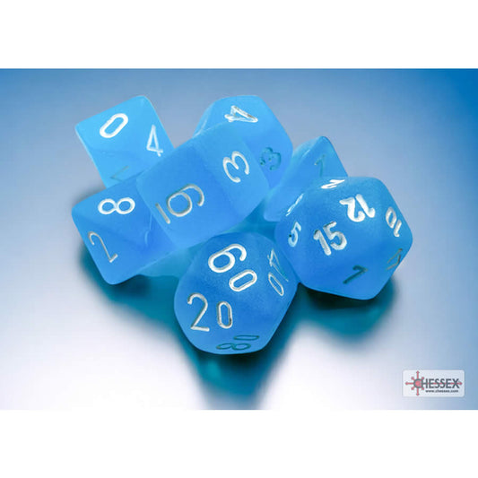 CHX20416 Caribbean Blue Frosted Mini Dice with White Colored Numbers 10mm (3/8in) Set of 7