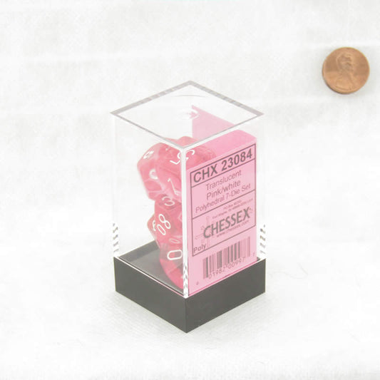 CHX20384 Pink Translucent Mini Dice with White Numbers 10mm (3/8in) Set of 7