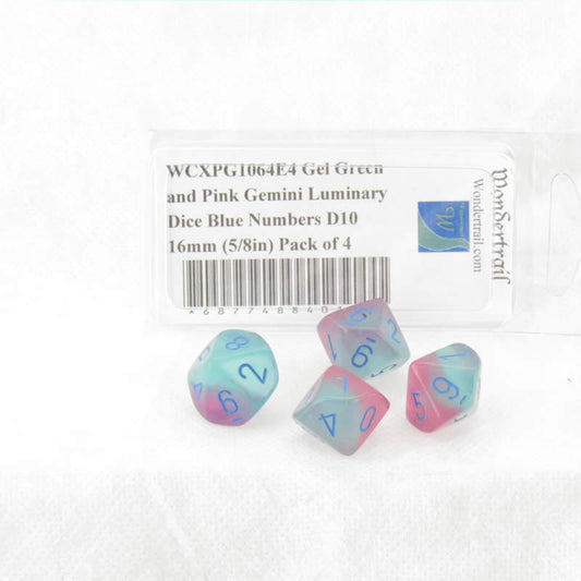 WCXPG1064E4 Gel Green and Pink Gemini Luminary Dice Blue Numbers D10 16mm (5/8in) Pack of 4