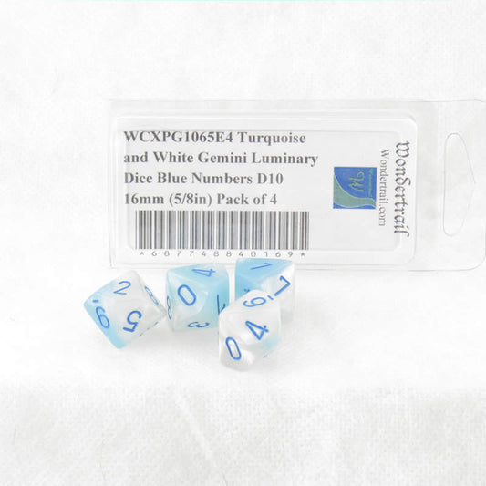 WCXPG1065E4 Turquoise and White Gemini Luminary Dice Blue Numbers D10 16mm (5/8in) Pack of 4