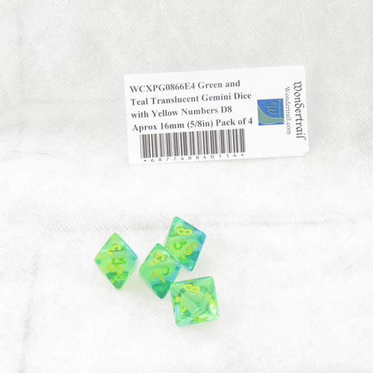 WCXPG0866E4 Green and Teal Translucent Gemini Dice Yellow Numbers D8 Aprox 16mm (5/8in) Pack of 4