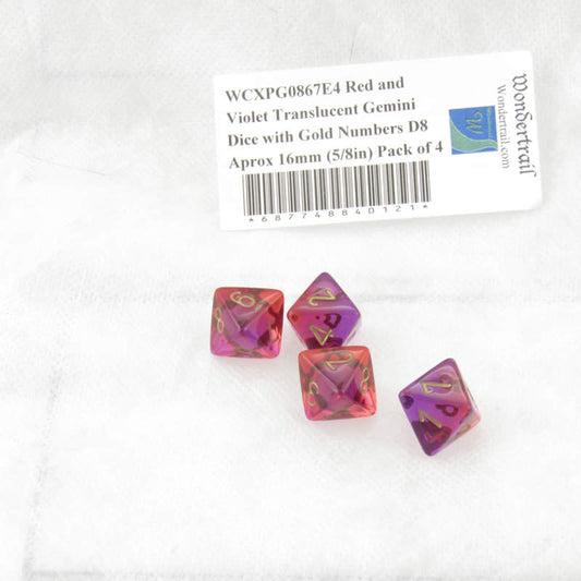 WCXPG0867E4 Red and Violet Translucent Gemini Dice Gold Numbers D8 Aprox 16mm (5/8in) Pack of 4