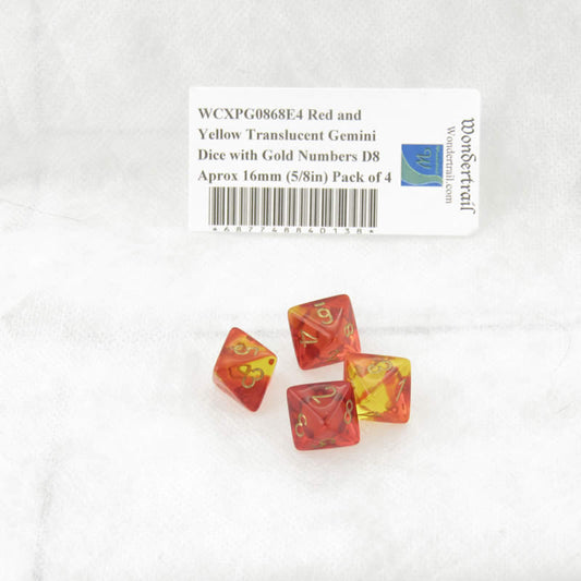 WCXPG0868E4 Red and Yellow Translucent Gemini Dice Gold Numbers D8 Aprox 16mm (5/8in) Pack of 4