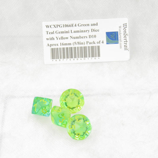 WCXPG1066E4 Green and Teal Gemini Luminary Dice Yellow Numbers D10 Aprox 16mm (5/8in) Pack of 4