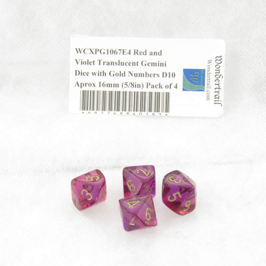 WCXPG1067E4 Red and Violet Translucent Gemini Dice Gold Numbers D10 Aprox 16mm (5/8in) Pack of 4