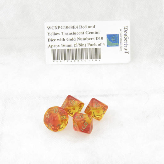 WCXPG1068E4 Red and Yellow Translucent Gemini Dice Gold Numbers D10 Aprox 16mm (5/8in) Pack of 4