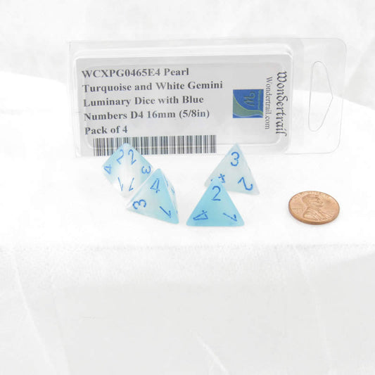 WCXPG0465E4 Pearl Turquoise and White Gemini Luminary Dice with Blue Numbers D4 16mm (5/8in) Pack of 4