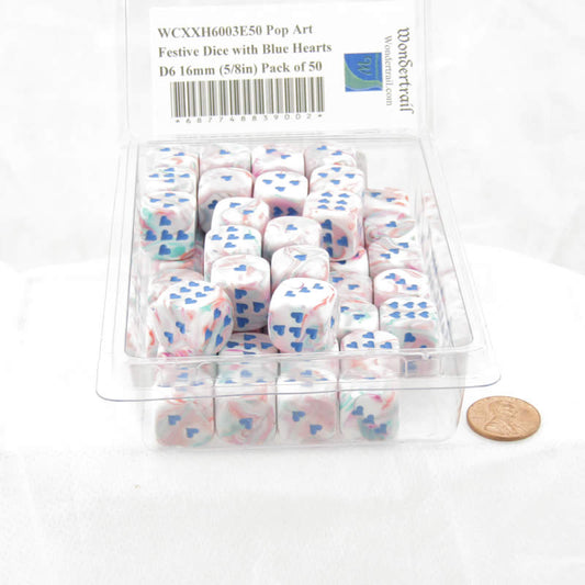 WCXXH6003E50 Pop Art Festive Dice with Blue Hearts D6 16mm (5/8in) Pack of 50
