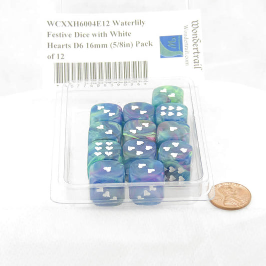 WCXXH6004E12 Waterlily Festive Dice with White Hearts D6 16mm (5/8in) Pack of 12