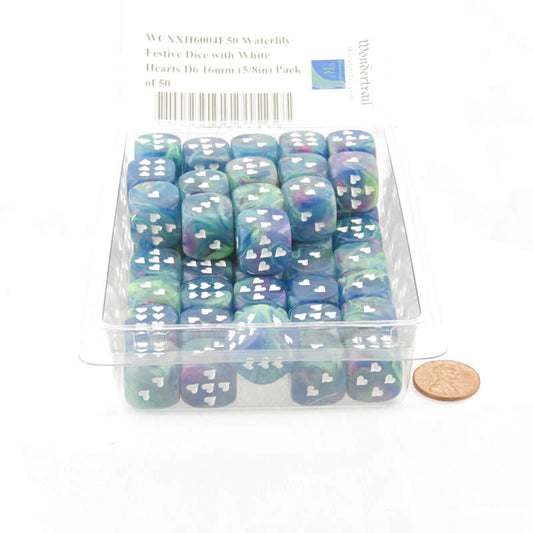 WCXXH6004E50 Waterlily Festive Dice with White Hearts D6 16mm (5/8in) Pack of 50