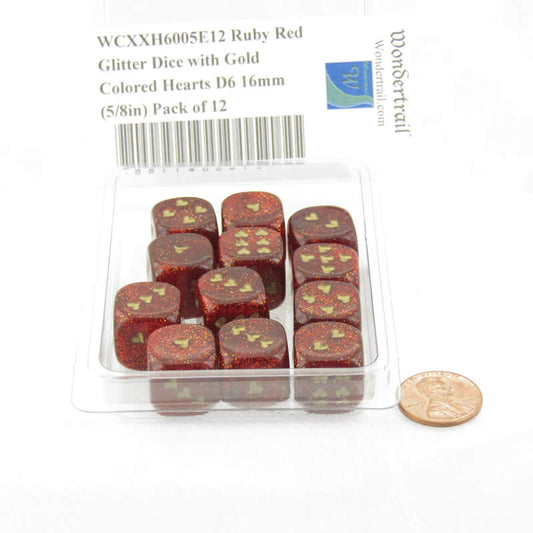 WCXXH6005E12 Ruby Red Glitter Dice with Gold Colored Hearts D6 16mm (5/8in) Pack of 12