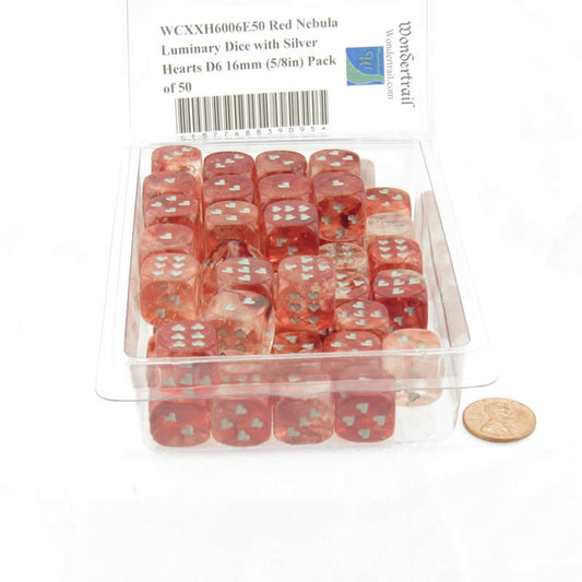WCXXH6006E50 Red Nebula Luminary Dice with Silver Hearts D6 16mm (5/8in) Pack of 50