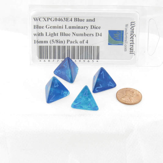 WCXPG0463E4 Blue and Blue Gemini Luminary Dice with Light Blue Numbers D4 16mm (5/8in) Pack of 4