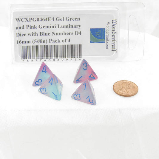 WCXPG0464E4 Gel Green and Pink Gemini Luminary Dice with Blue Numbers D4 16mm (5/8in) Pack of 4