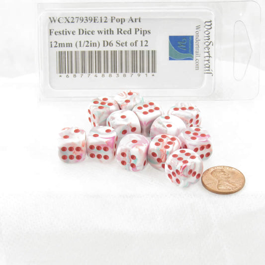 WCX27939E12 Pop Art Festive Dice with Red Pips 12mm (1/2in) D6 Set of 12